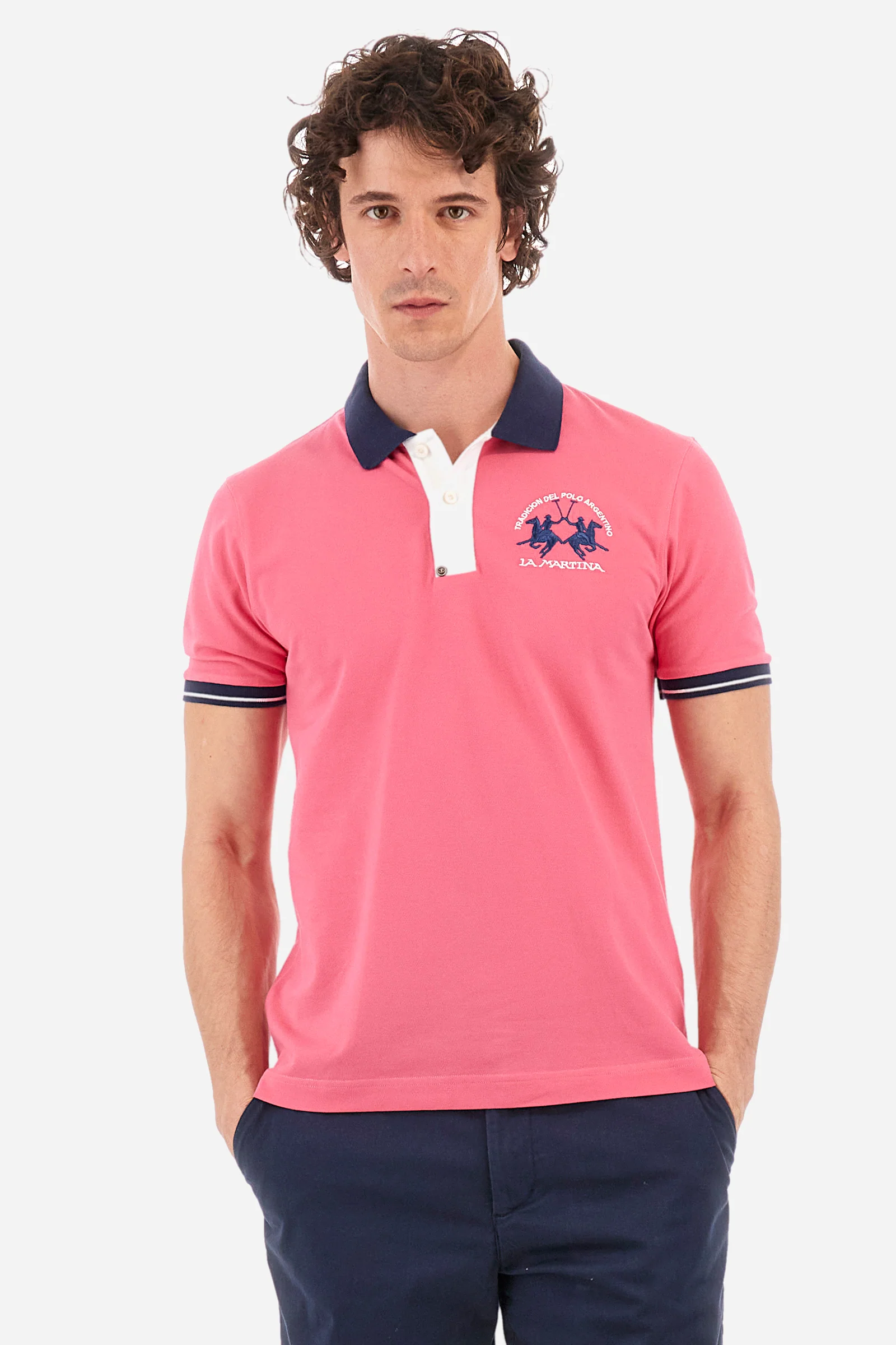 * Maniche corte * In cotone elasticizzato * Colletto e giromanica a coste e di tonalità differente * Tinta unita * Scritta "La Martina" sotto il colletto * Logo grande ricamato sul petto * Vestibilità regolare